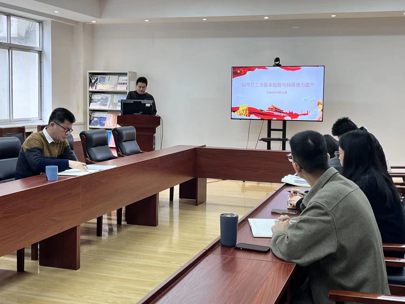 辅导员颜枫担任主讲人。学院党委副书记兼副院长刘名森出席会议,全体专职辅导员参加会议。