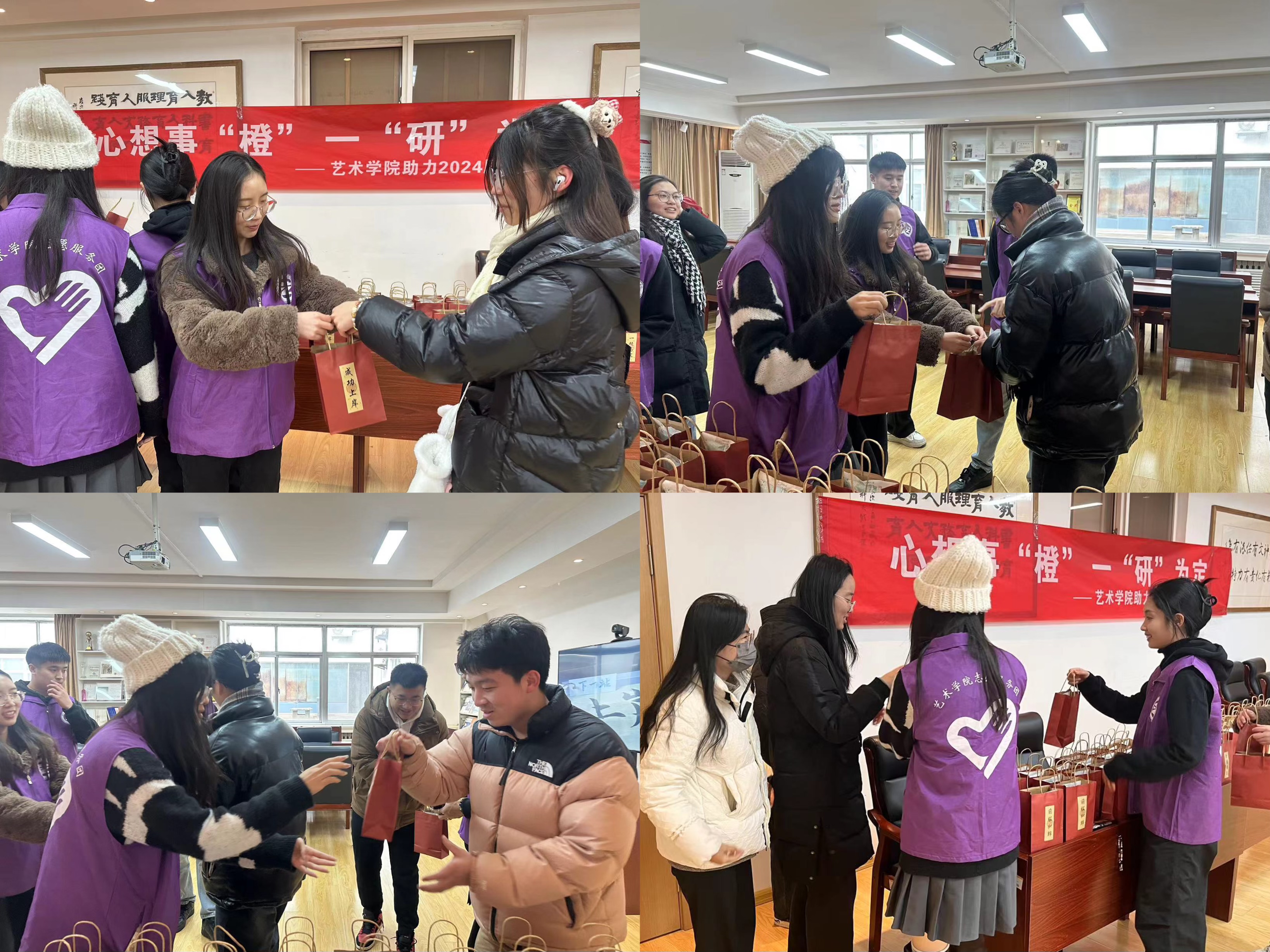 学院精心准备150份考研暖心礼物,有“金榜题名”、“成功上岸”、“前程似锦”等美好寓意的手提袋,“脐”开得胜、心想事“橙”的橙子,考研助力糖果和口罩,并设立“考研加油站”,用满满的仪式感,为考研学子加油鼓劲,送去亲切关怀和祝福。杨橙向到场的考研学子送去冬日祝福,肯定了考研学子备战以来的艰辛付出,鼓励同学们勇毅前行、一战成硕,同时与考研学子们亲切交流,了解他们的备考情况和需求,为他们提供一些心理支持。学院的关怀和支持让同学们感受到了关爱与温暖,收到考研小礼物的同学们倍感暖心,纷纷表示感谢,也更加坚定了成功上岸的信心。