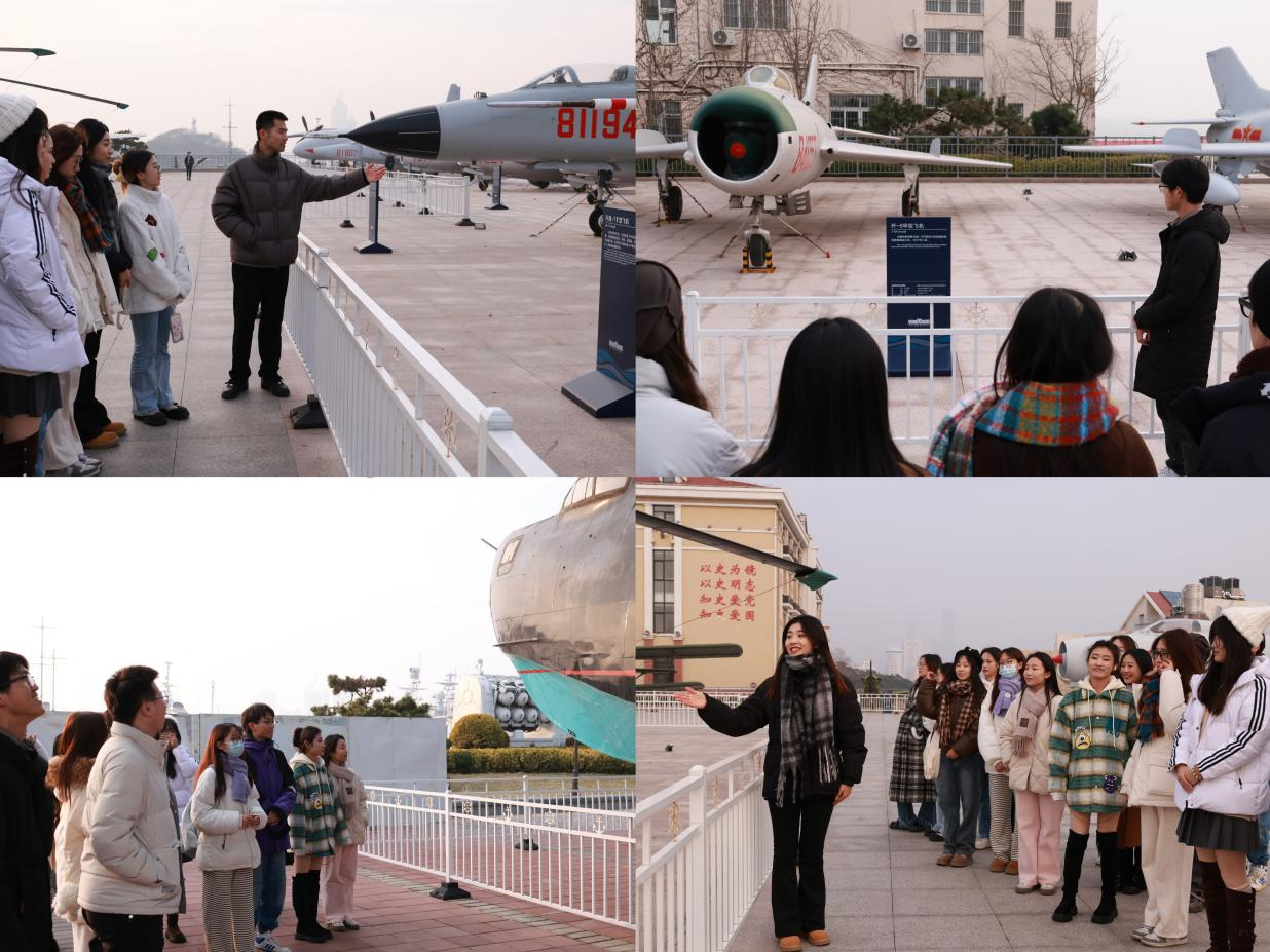 参观完室内展区之后,师生又集体来到了室外展区进行参观,在军舰展览区,登上了停泊在码头上的长江舰和济南舰,近距离感受退役军舰的威武雄壮,在舰载飞机展区,支部书记盛老师和支部组织委员杨老师领学了功勋舰载飞机的型号、性能参数和战斗历史。